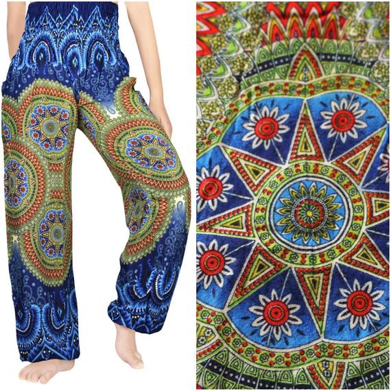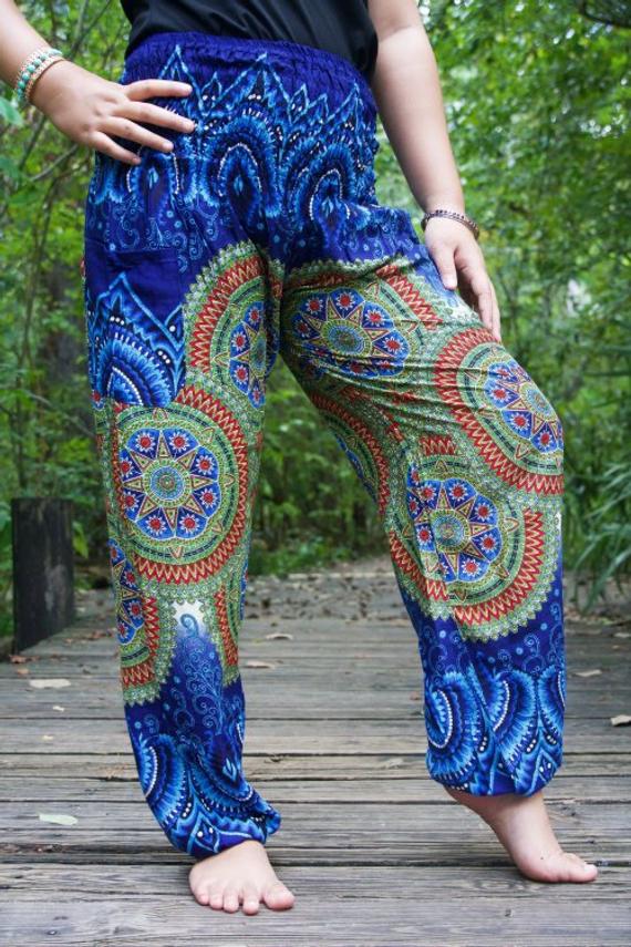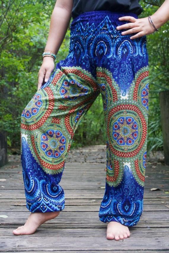Loose and supremely comfortable Harem Pants. They are unisex and have both an elastic waist and ankles for a flexible fit. Standard one size fits most (US size 0-14Â or XS-L). Our harem pants are handmade with lightweight 100% rayon that is extremely breathable and flowy. These pants are great for exercise, yoga, taking a walk in nature or the beach, festivals, family get together, or just relaxing at your home.