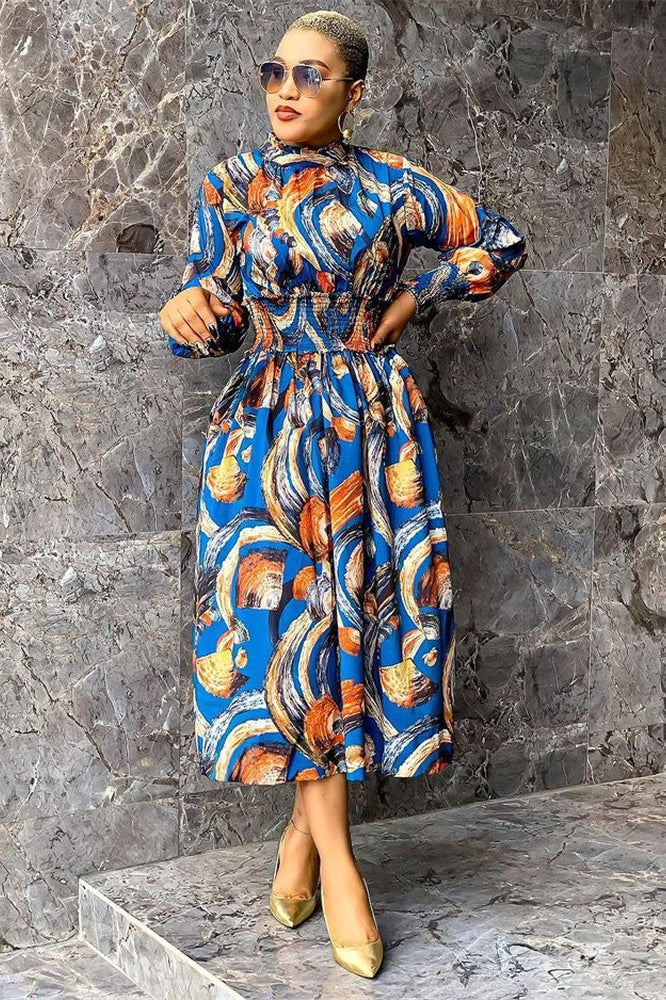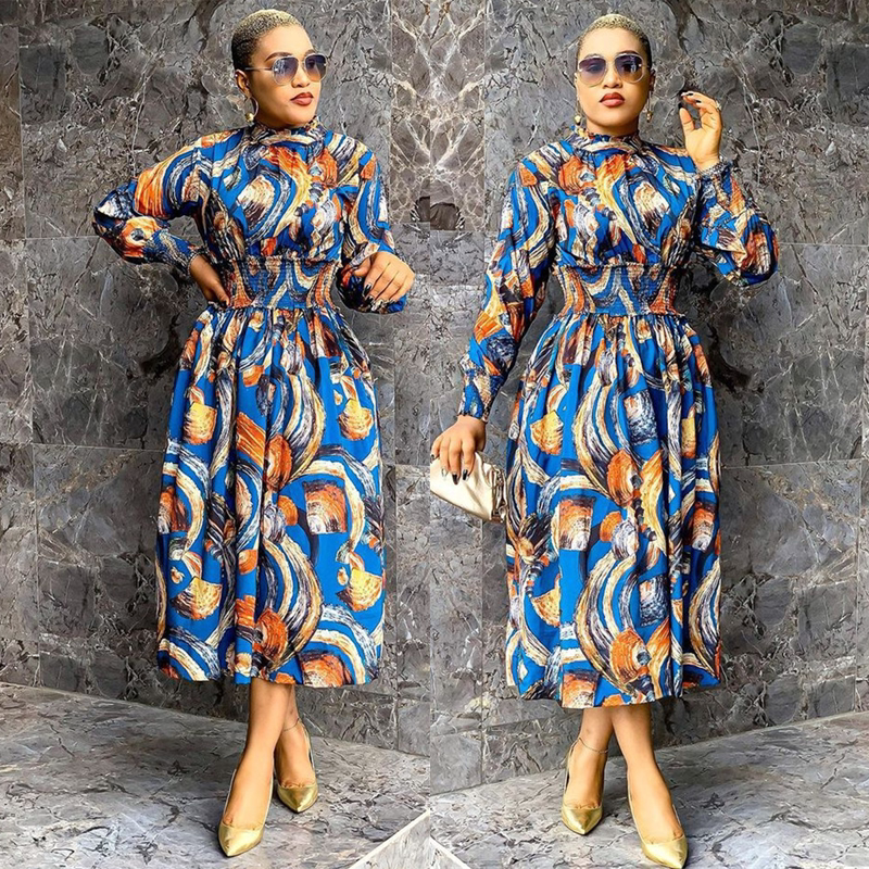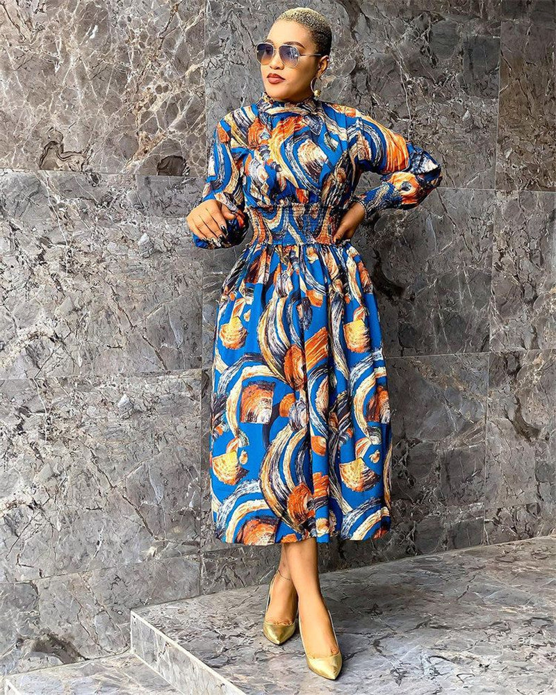 Women Clothing Fashion Printing Lapel Long Sleeve Dress